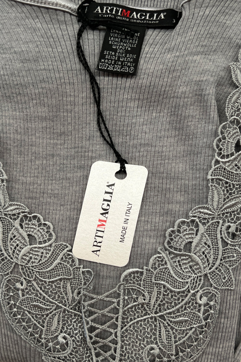 Elegante maglietta sottogiacca da donna con mezza manica, realizzata in pregiata lana merino e seta per garantire comfort e morbidezza. Il delicato inserto in macramè aggiunge un tocco raffinato e distintivo, ideale per chi cerca uno stile sofisticato e senza tempo. Perfetta come capo versatile da indossare sotto giacche o da sola, offre una piacevole sensazione sulla pelle e un’eleganza discreta.