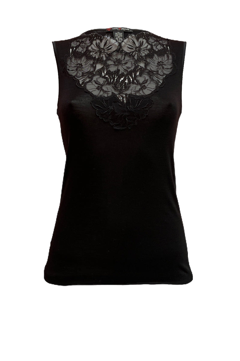 Maglia smanicata in 70% lana merino extrafine e 30% seta di prima qualità caratterizzata da un bellissimo ed elegante inserto in macramè svizzero Bishoff in tulle ricamato con parti in macramé.