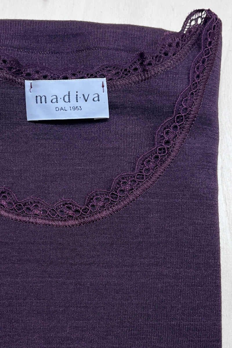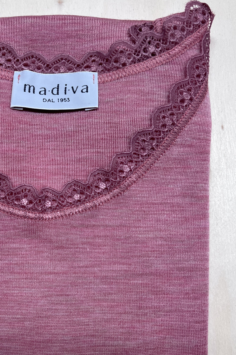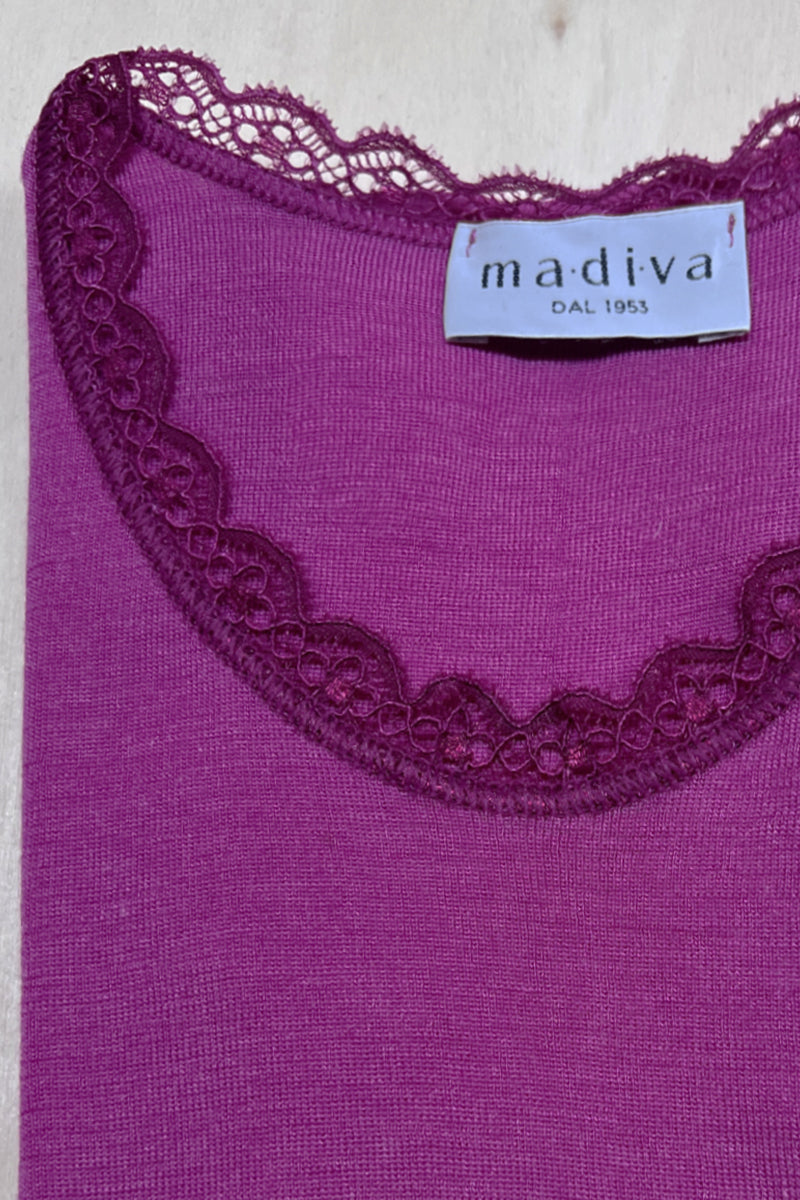 Canottina spalla larga in 85% lana merino extrafine e 15% seta.