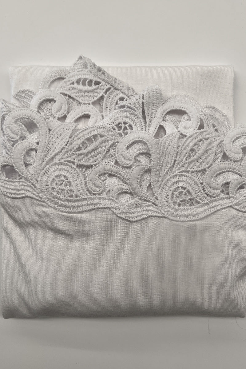 NARCISO, maglietta donna in puro Micromodal. Mezza manica con scollo barchetta e balza macramè artigianale che impreziosisce il capo con dettagli di raffinata eleganza. Composizione: 92% Micromodal, 8% elastan. La fibra avvolge il corpo con straordinaria morbidezza, garantendo traspirabilità e libertà di movimento. Prodotta interamente in Italia, rappresenta l'eccellenza artigianale per chi apprezza il design consapevole e la qualità senza compromessi.