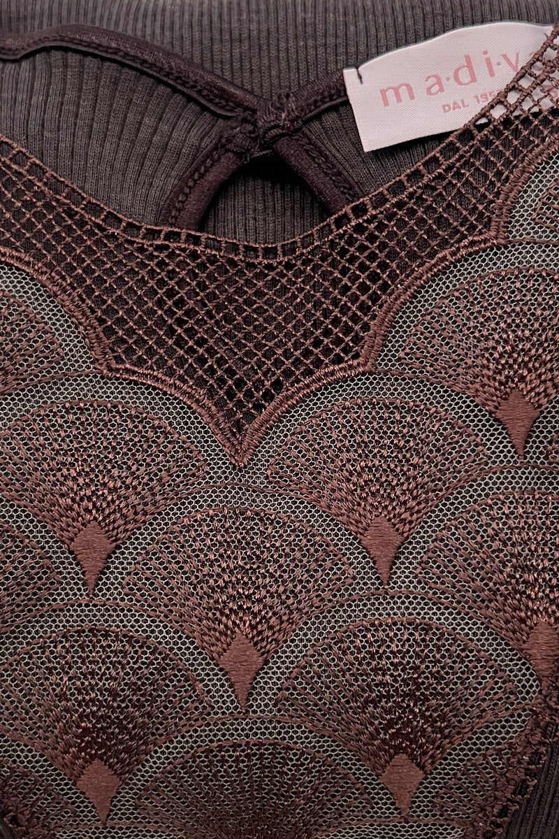 Long-sleeve crew neck women's sweater, made of fine ribbed Wool/Silk with a nude effect tulle insert and macramé with an oriental design. The natural fibers of wool and silk blend wonderfully, giving the garment softness, warmth, and excellent fit, so you don't have to give up being sexy even on the coldest days. Wool-silk is warm yet soft; this makes it suitable for very sensitive skin. Entirely made in Italy with the highest quality materials. 85% extrafine merino wool and 15% silk