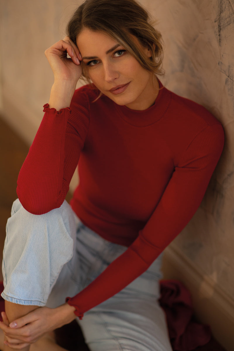 The natural fibres of wool and silk blend together exquisitely, giving the garment softness, warmth and excellent wearability, so that one does not have to renounce being seductive even on the coldest days. Shrink-proof, breathable, insulating and extremely warm. Made exclusively from natural fibres. The silk-wool yarn is warm and yet soft; this makes it suitable even for particularly sensitive skin.