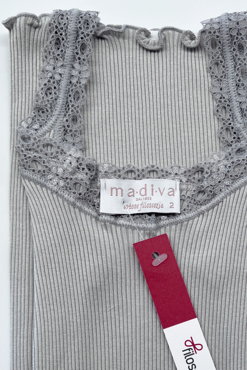 Ribbed camisole Top 100% Filoscozia cotton with elastic little lace. Filoscozia® cotton yarn is hypoallergenic, antibacterial, hygroscopic, it absorbs and disperses the body's natural perspiration and contains no soluble proteins. Entirely made in Italy from premium quality materials. Machine washable at 40°. Entirely made in Italy.