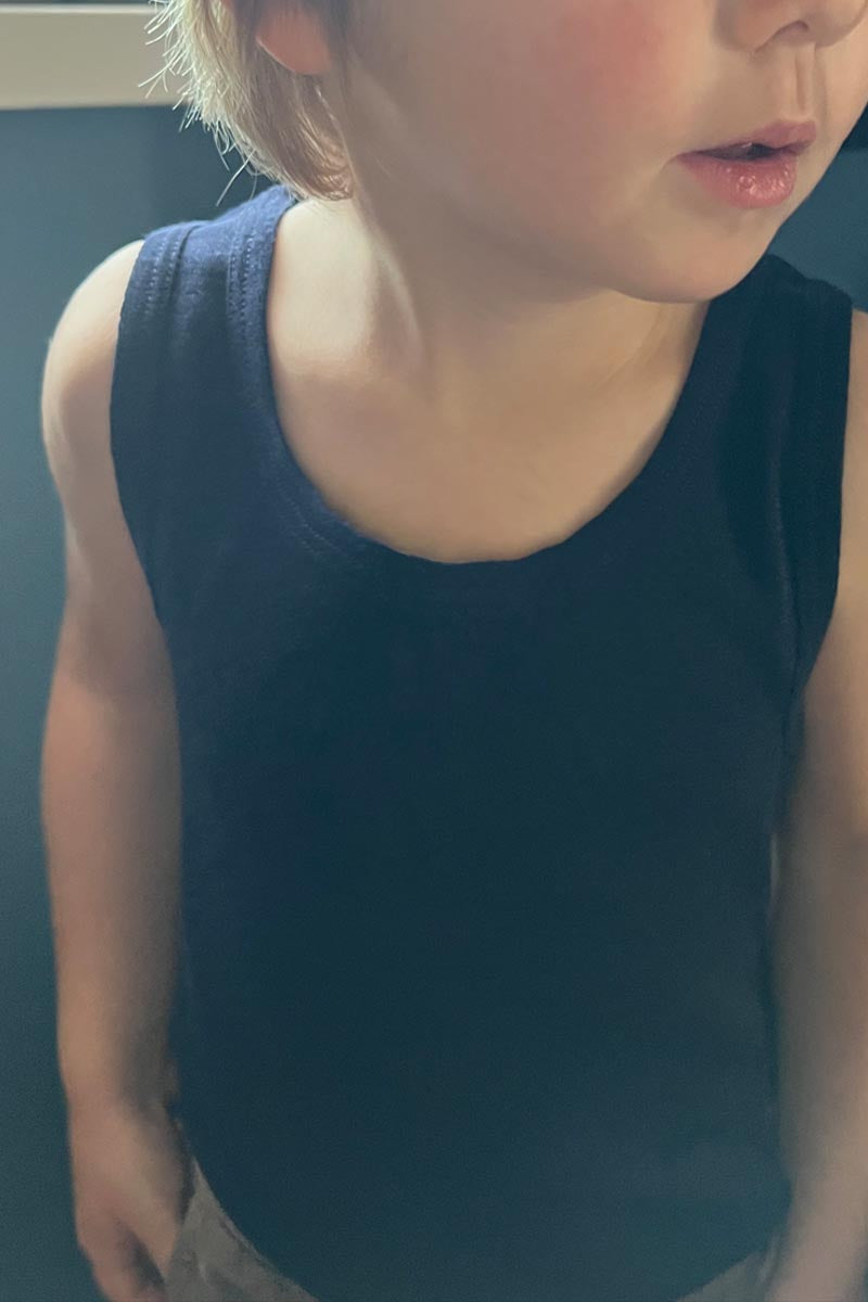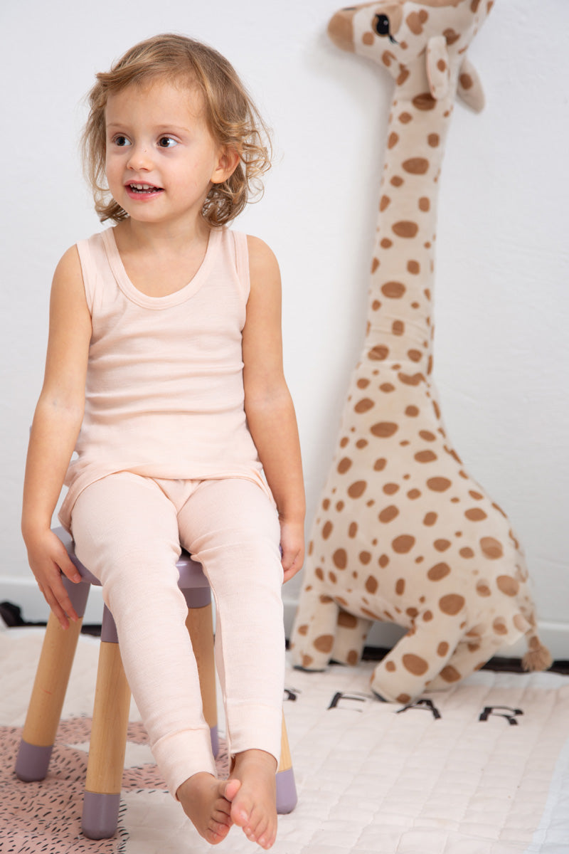 Sleeveless in 85% wool and 15% silk. Perfect to wear as a tank top on the skin to warm our babies' tummies without making them sweat. Complete the outfit with the long sleeve Trottola model.